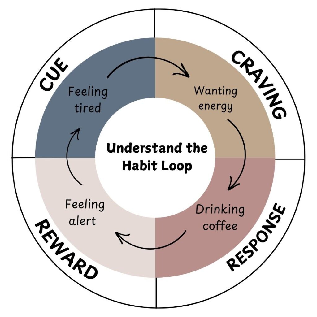 Duhigg complicates the habit loop story by pointing out that craving often preceeds the routine and motivates people to engage in the behavioral routine that will deliver the reward. After associating a cue with a reward, our brain starts to anticipate the reward and brain activity that used to be associated with the reward occurs before the reward is achieved. This brain activity can be interpreted as craving the reward. Duhigg views craving as "driving" the loop - it appears as embedded in the middle of the loop. James Clear views "craving" as a stage (stage 2) that falls between the cue (stage 1) and the routine (stage 3) which motivates a person to engage the routine. The reward is Stage 4 in Clear's framework. The diagram below uses the example of coffee drinking to convey the 4 stage habit loop.